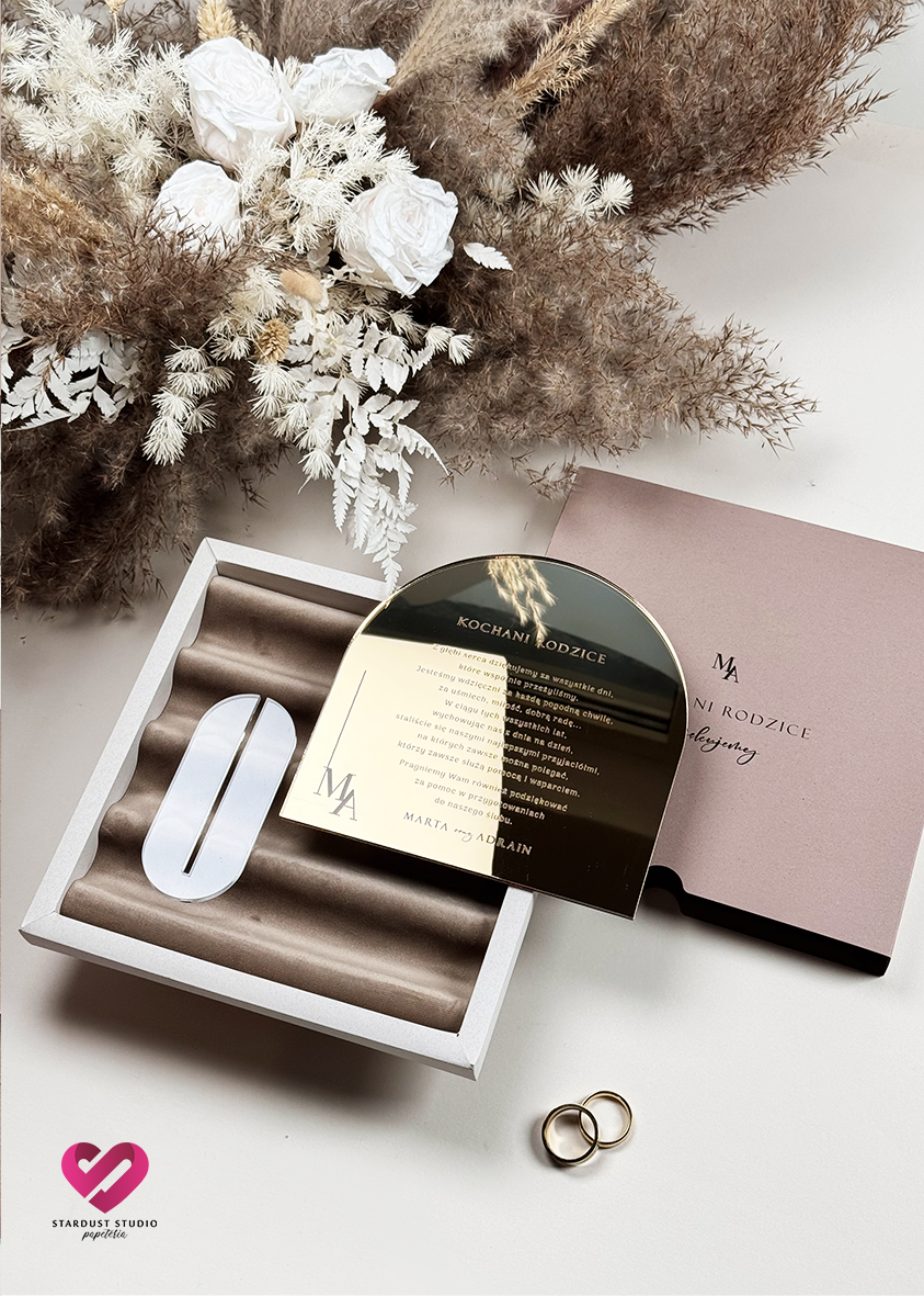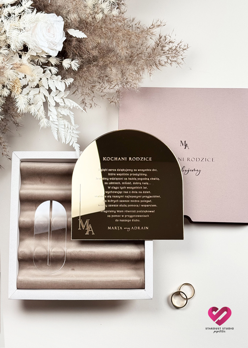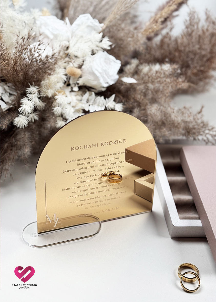 Elegancka forma złotej, lustrzanej pleksi z personalizowaną dedykacją, zamknięta w welurowym pudełku. Każdy detal – od miękkiego wnętrza, przez starannie dobraną typografię, aż po zaokrąglony kształt – podkreśla wyjątkowość tej chwili.