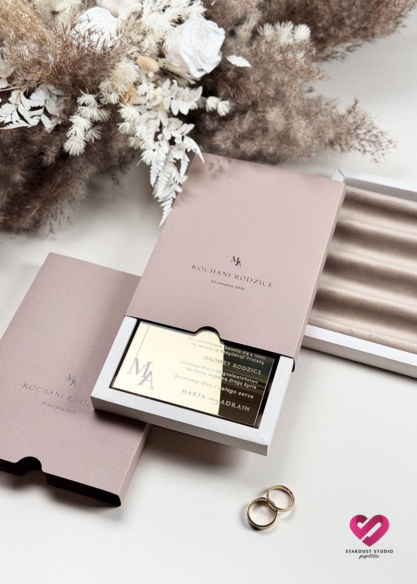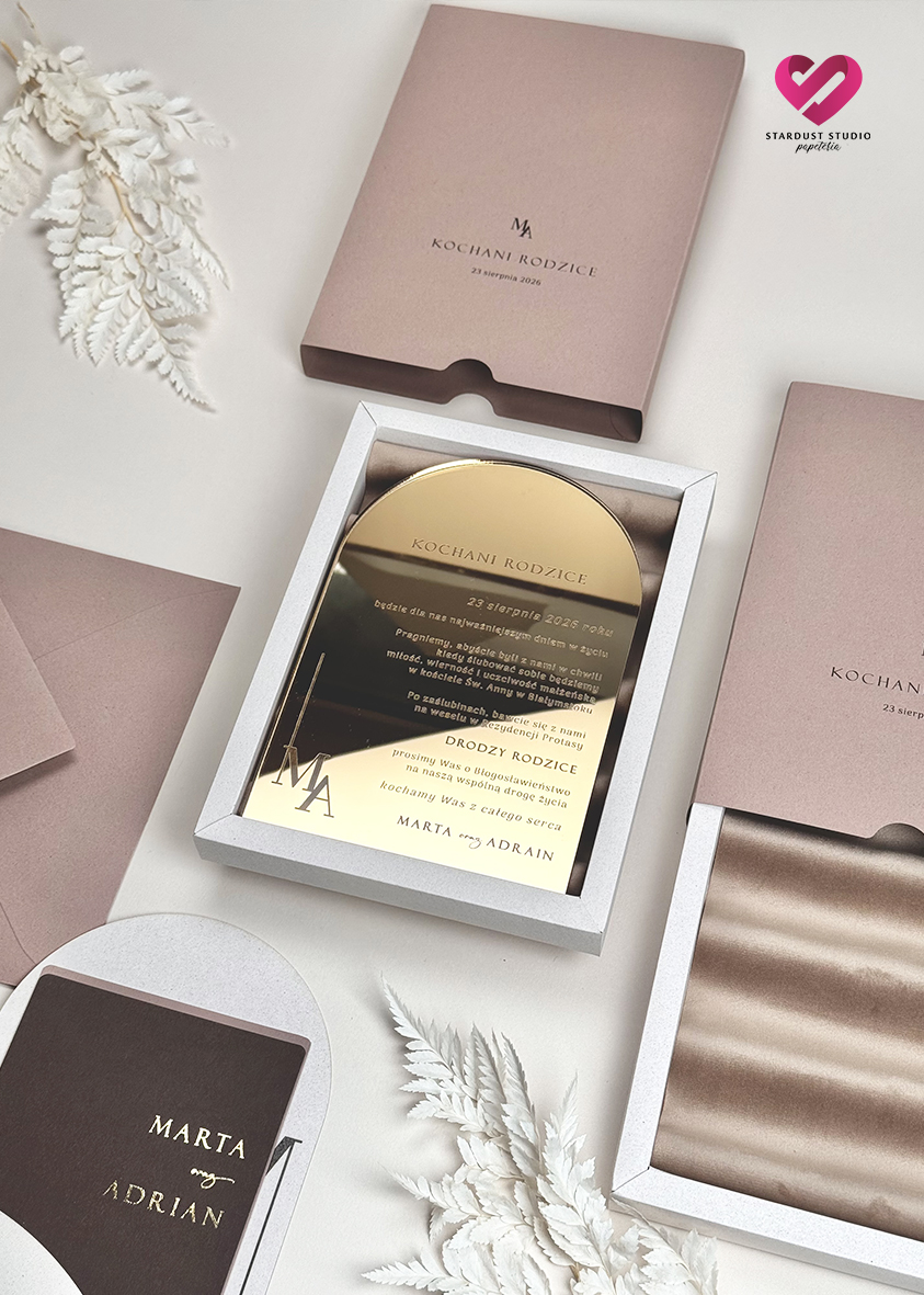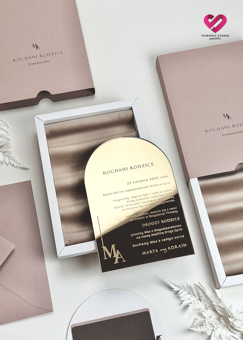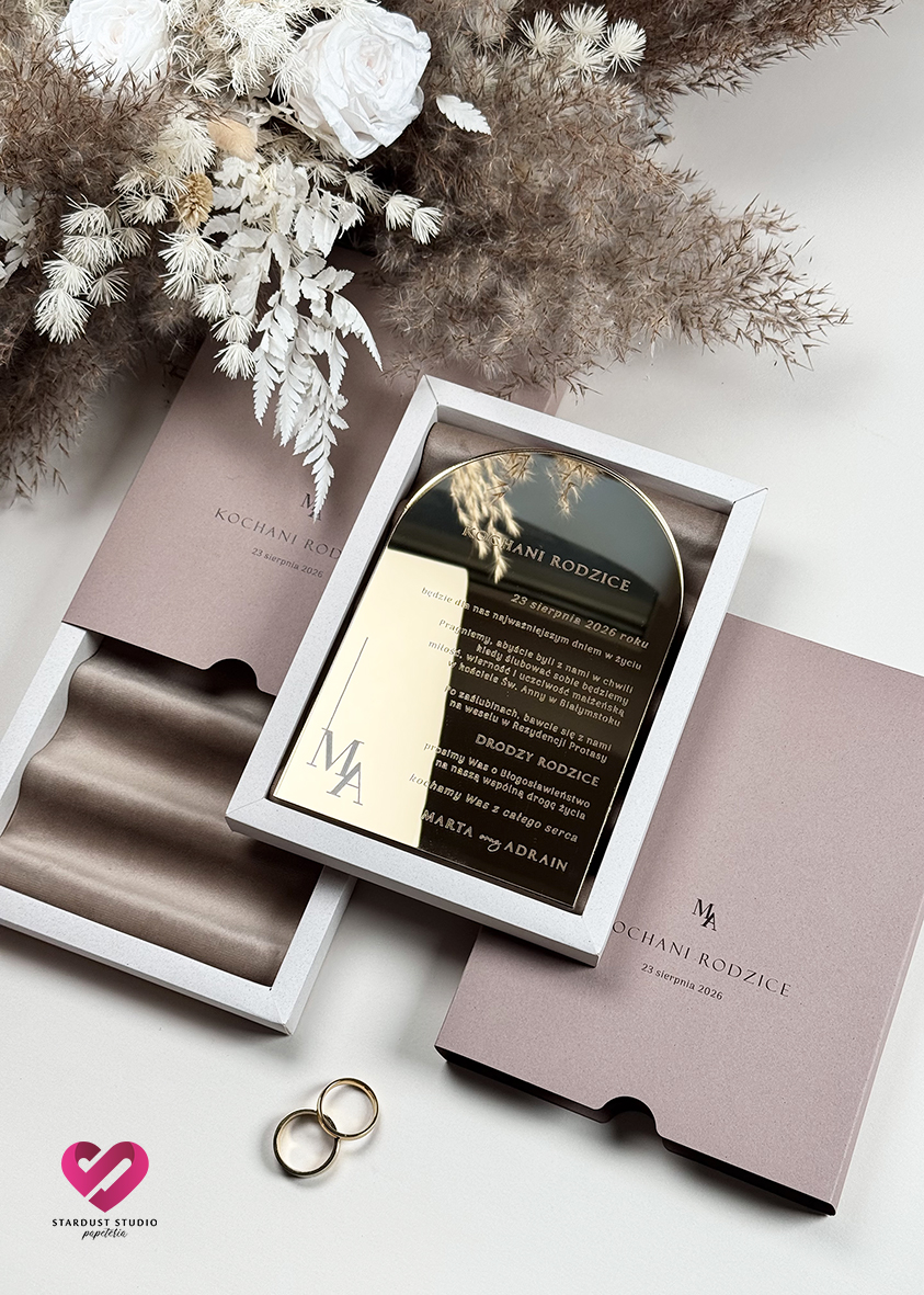 Zaproszenia dla rodziców z prośbą o błogosławieństwo wykonane z luksusowej, złotej lustrzanej pleksi. Całość zamknięta w wysuwanym pudełku w wybranej kolorystyce kolekcji – w ciepłym, kakaowym odcieniu z welurową wyściółką, która dopełnia wrażenie klasy i wyjątkowości. Ich minimalistyczna forma została wzbogacona o personalizowaną treść oraz monogram, tworząc niepowtarzalny upominek, który zostanie z rodzicami na długo.